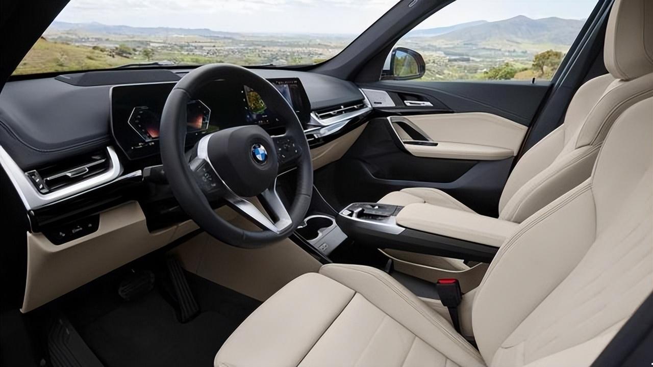 新一代宝马X1内饰最大亮点是配备曲面双联屏,它由一个10.25英寸的仪表盘和一个10.7英寸的中控触摸显示屏组成,屏幕位置靠近主驾驶位。这种双联屏算当前中控屏幕设计的主流,极大提升车辆科技感。